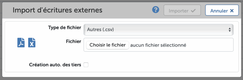 L’import s’effectue grâce à la fonction au bouton « Saisies » , puis « Importer des écritures«